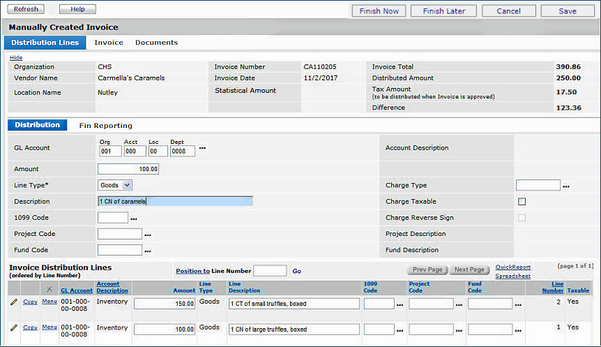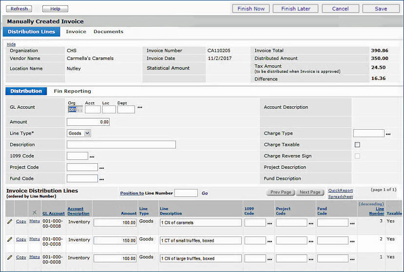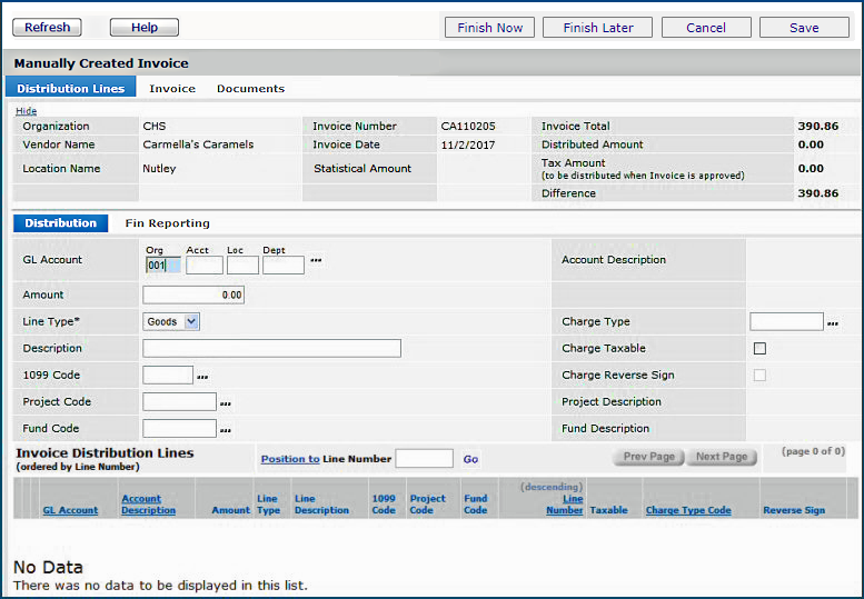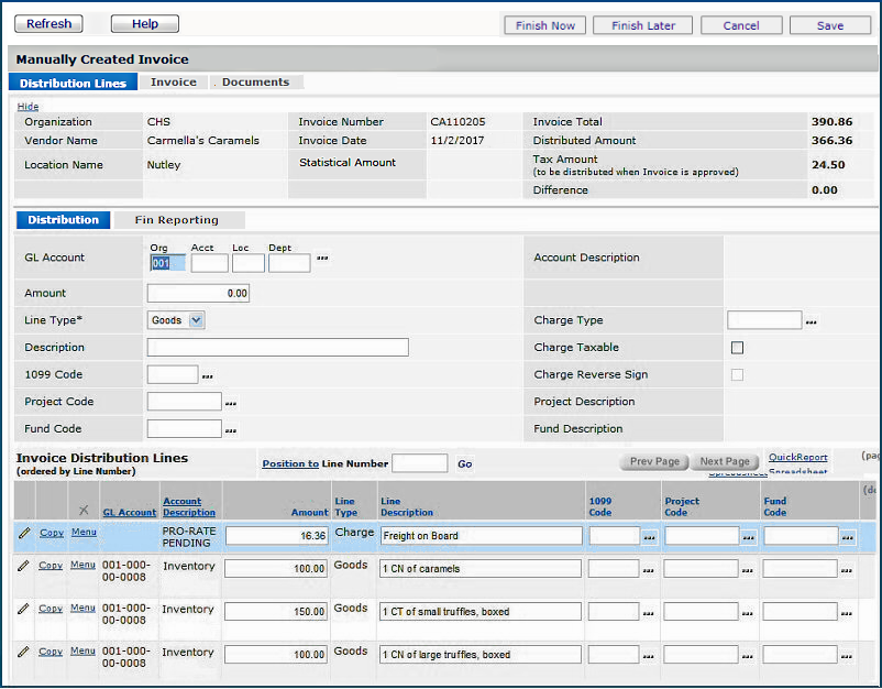 A distribution profile may be associated with the invoice vendor. If so, the system automatically creates distribution lines as specified in the distribution profile. Also, if your organization has a General Ledger account specified for Freight and/or Other (in the Organization record), the system will pre-build distribution lines for those categories on the invoice. (If you don't use the lines, they are automatically deleted when you click Finish Now.) Otherwise, if the invoice has no appropriate pre-built lines for charges (as in Figure 1), you need to create the lines yourself.
