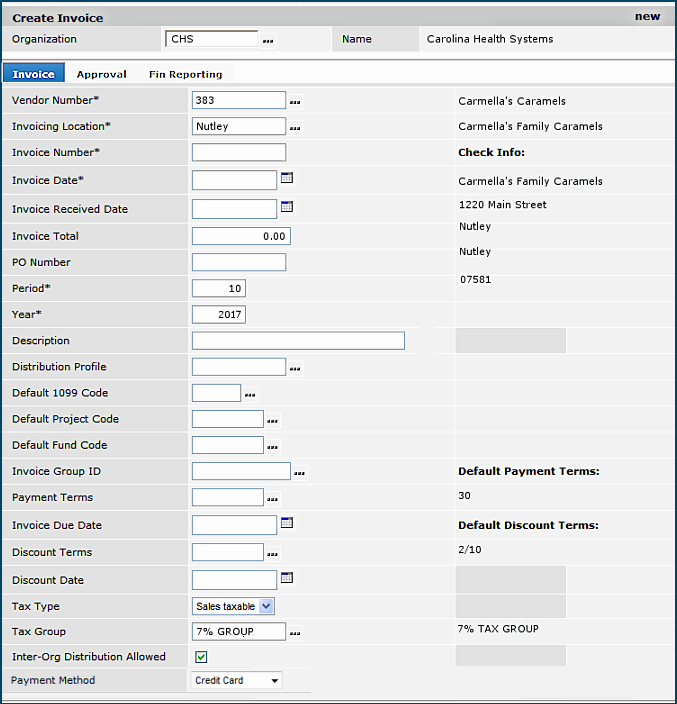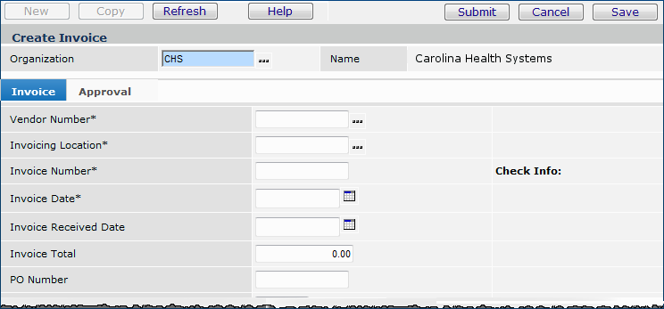Be sure to check fields on both tabs -- Invoice and Approval -- for fields that you may need to complete.