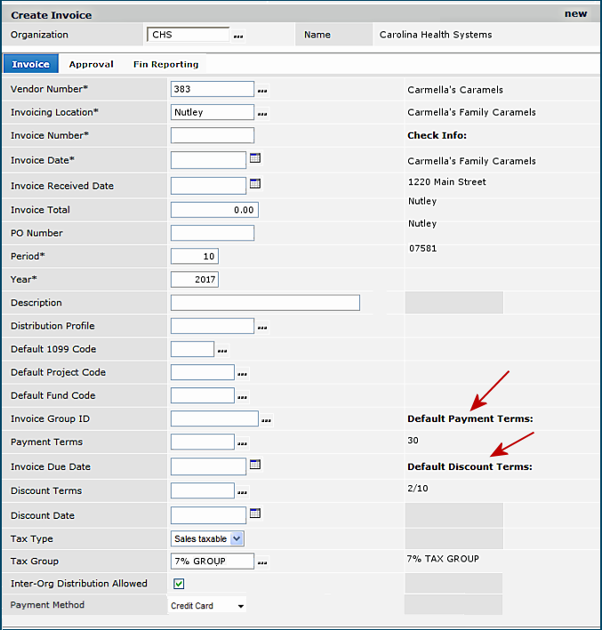 Figure 2 is a manual invoice header with several fields completed. Notice that the Payment Terms and the Discount Terms are initially set to the vendor's AP location defaults (red arrows). You can change the Payment Terms and Discount Terms by selecting new values from the prompt.