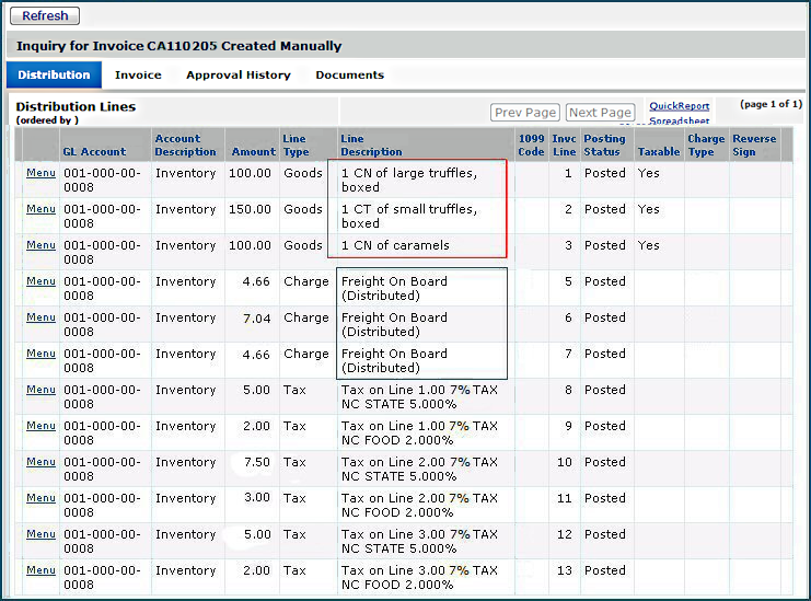 Once an invoice is completed and approved, you can review it to see how the system distributed amounts for goods, charges, and tax to accounts.
