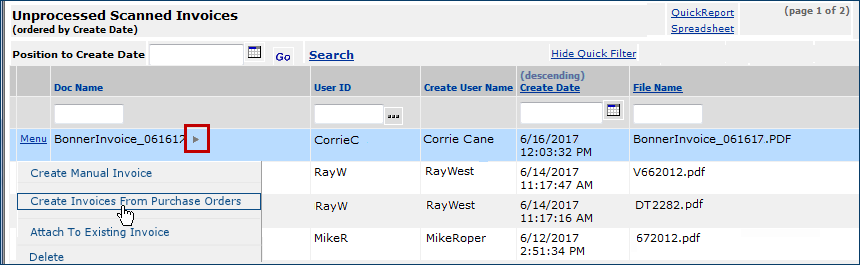 Each user who works with invoices needs a network folder -- an "inbox" -- for scanned invoices that are picked up by Pulse and uploaded to Accounts Payable. Panels in Accounts Payable provide access to scanned invoices for each user of this feature. Panel menus provide actions such as creating a new purchase order invoice or manual invoice. Scanned invoices used to create an invoice can be attached to the Invoice Documents panel.