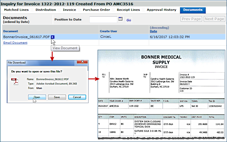 Documents can be attached to invoices. The documents can be viewed, added, or deleted when editing or inquiring on an invoice.
