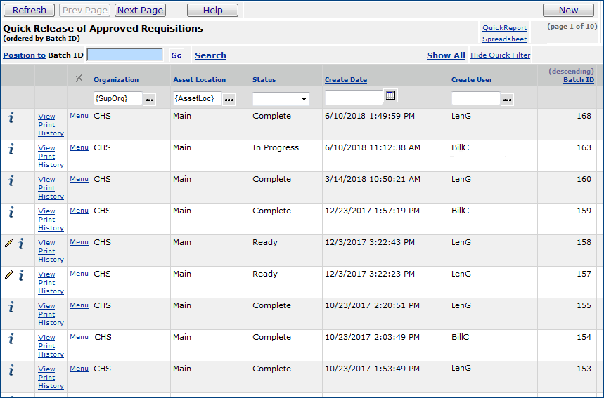 The list of Quick Release of Approved Requisitions (batch jobs) appears (Figure 1). (The list contains No Data if you have not created any Quick Releases.)