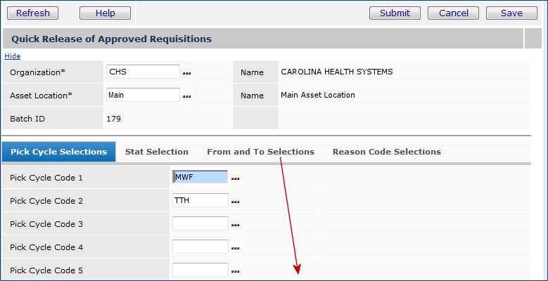 - The Pick Cycle Selections tab lets you specify up to five pick cycle codes. A Pick Cycle Code is a field on a requisition. The system selects the approved requisitions with the codes you specify.