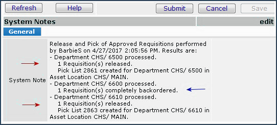 Notice in Figure 2 that the Quick Release processed requisitions for Department 6500, Department 6600, and Department 6610. Two of the requisitions were released (red arrows) and pick lists created. One requisition (blue arrow) was backordered.