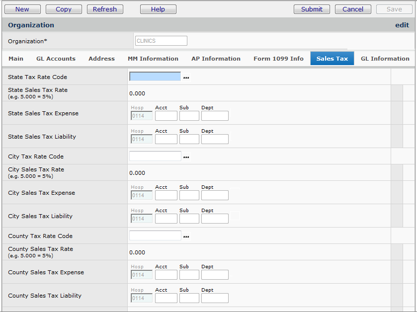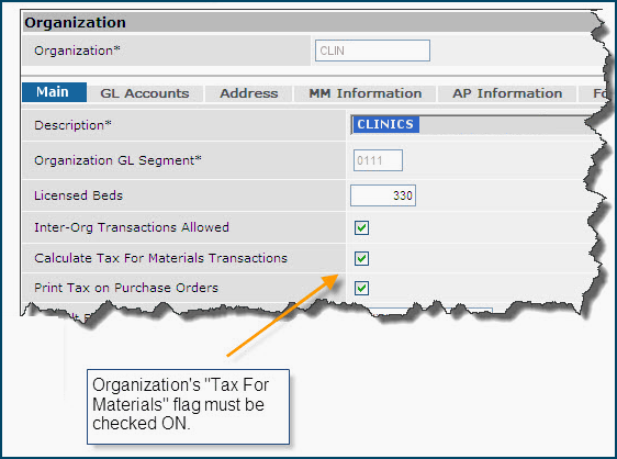Some hospitals need to order items for locations that are in different cities, and different cities may have different tax rates. Because tax is determined based on where product ships to, not where it is ordered from, an invoice may be out of balance when it is created. To accommodate this need, you can set a materials tax rate for a department, and require tax to be calculated at the department rate in situations where the jurisdiction for the department is different from the organization, and tax is different. Similarly, you can set tax rates for asset locations, where the asset location may be in a different geographical area, compared to the organization. Tax can also be set up for vendor AP locations, if needed.