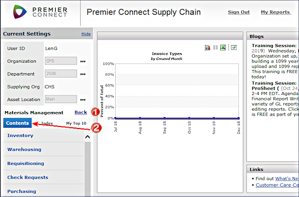 For example, selecting Materials Management displays the Materials Management contents.