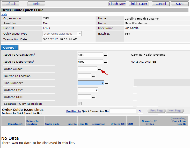 Figure 3 - Order Guide Quick Issue: Find the Order Guide Item Line
