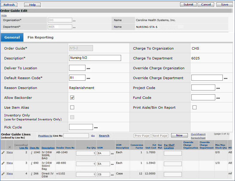 4. Edit the order guide as needed. When you are finished, click Submit. The system returns you to the Order Guides list.