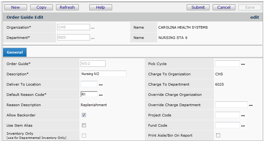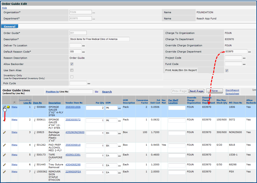 A requisition created from a par cart/order guide will use the Override Charge Department field for an item specified by the order guide/par cart line.