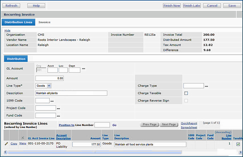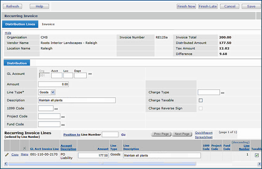 The Invoice Total (Figure 3, upper right corner) should equal the Distributed Amount plus any Tax Amount, and the Difference should be zero. Otherwise, the recurring invoice will be Incomplete, and you will not be able to process it.