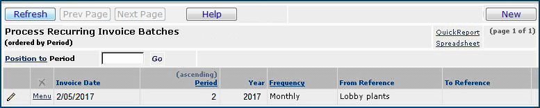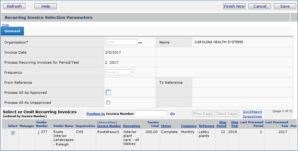 For example, the fields entered in Figure 5 select invoices with a Monthly Frequency, and a Reference field that contains "Lobby plants."