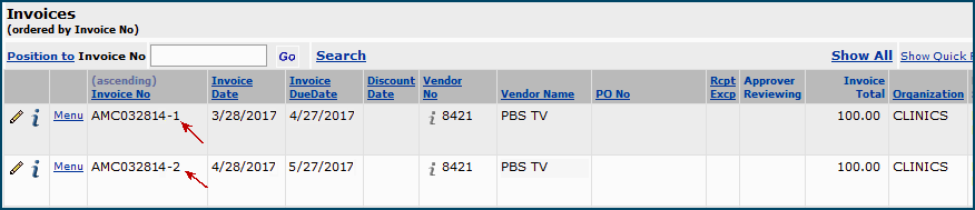 On the recurring invoice, note the integers (1 and 2) with a hyphen appended to the invoice number for each instance of processing. On a recurring invoice , the Invoice Due Date is calculated from payment terms, which default from the vendor AP location.