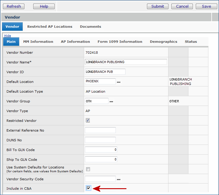 Figure 33 - Setting the "Include in Sourcing and Contract Management (C&A)" Flag for a Vendor