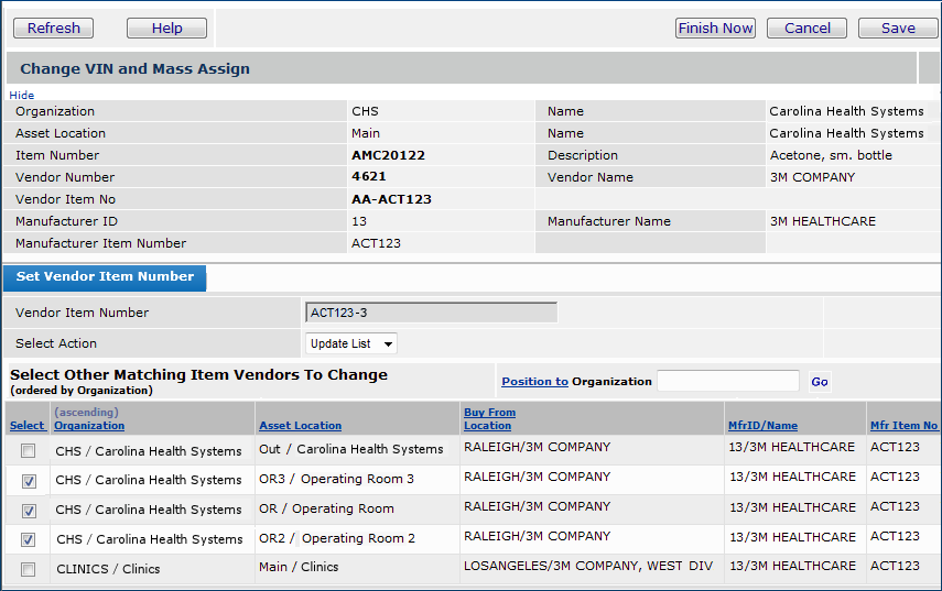The Change VIN and Mass Assign panel appears (Figure 25). This panel contains a list of the asset locations where the vendor item number (VIN) for the item can also be changed. The listed asset locations likely do not include all of the asset locations available to you based on your data profile. Missing asset locations are those that do not conform to one of the rules, for example, an asset location where the item/vendor does not exist.