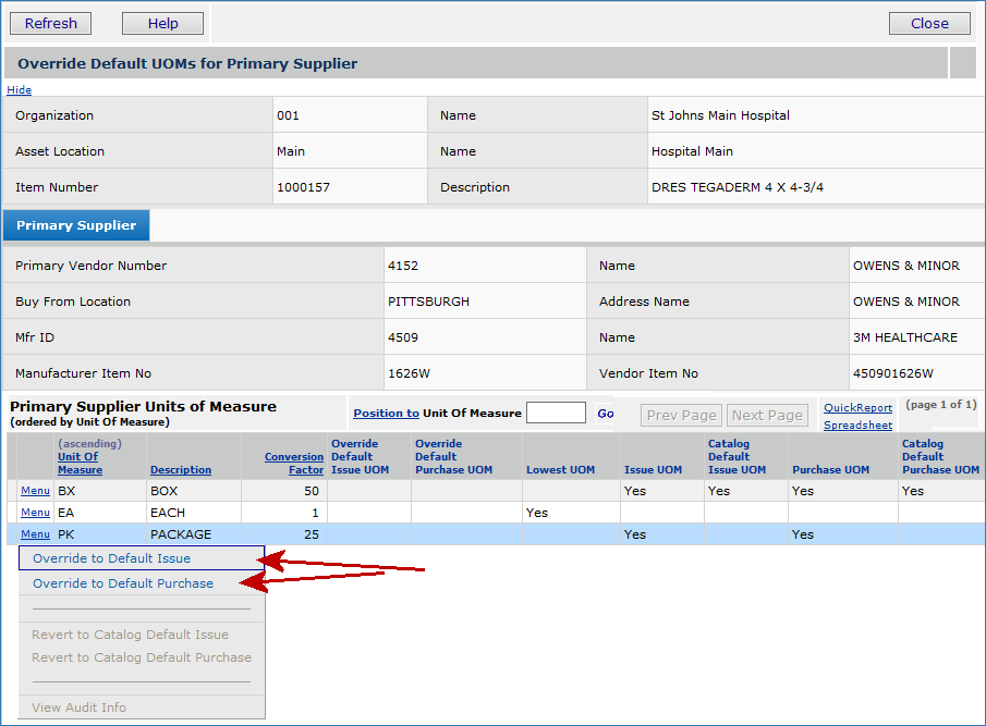 - Select the change that you wish to make. In Figure y, the user is setting the UOM "package" as the default issuing UOM for this item in this asset location from the primary supplier.