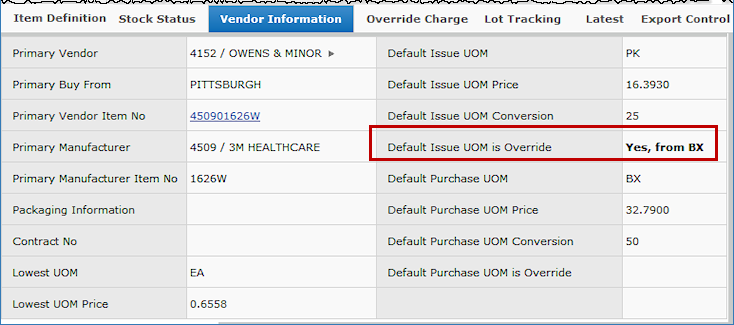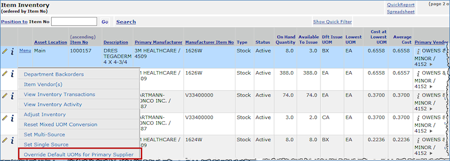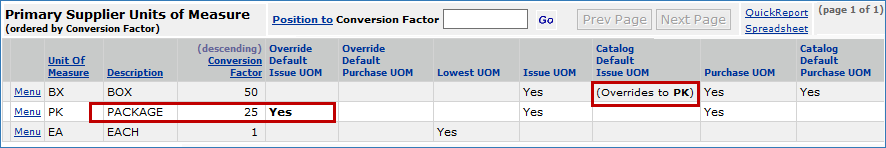 For items that are active, single sourced, and have multiple units of measure, a menu option Override Default UOMs for Primary Supplier is available. Any user who has the "Inventory" role object settings Modify, Create, or All can use the menu option to change the primary supplier's default issue or the default purchase UOM.