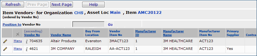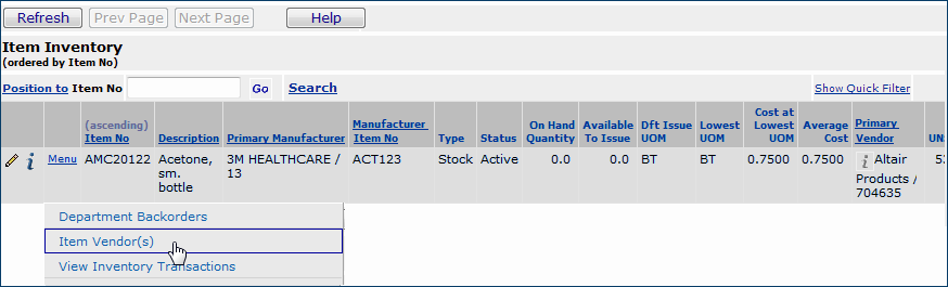 - Locate the item of interest. Click Menu and select Item Vendors.
