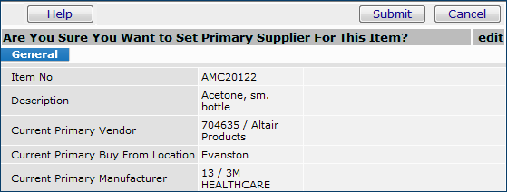 - The system asks if you are sure that you wish to set the Primary Supplier for the item.