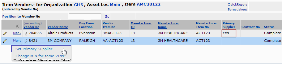 - Locate the vendor that you wish to designate as "Primary Supplier." Select Menu > Set Primary Supplier.