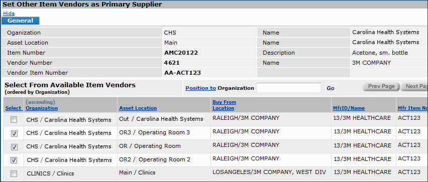 The Set Other Vendors as Primary Supplier panel appears (Figure 23). This panel contains a list of the asset locations where the primary supplier for the item can also be changed. The listed asset locations probably do not include all of the asset locations available to you based on your data profile. Missing asset locations are those that do not conform to one of the rules; for example, an asset location that does not allow multi-sourcing will not be on the list.