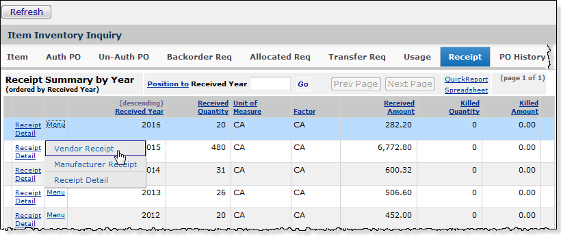 - Click the Receipt tab. Summary receipt data for the year for the item appears.