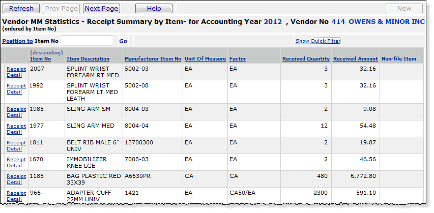 Receipt statistics for vendors are available from the vendors Quick Click panel. The statistics contain summary data (by year) and detailed data (by month) on receipts for items supplied by the vendor.
