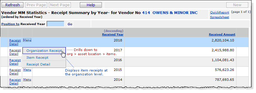 From each yearly summary line for a vendor, you can drill down to more receipt statistics (both summary and detail), for each organization and for vendor items at the organization level. Similarly, you can view summary and detailed receipt statistics at each asset location, and for vendor item receipts within an asset location.