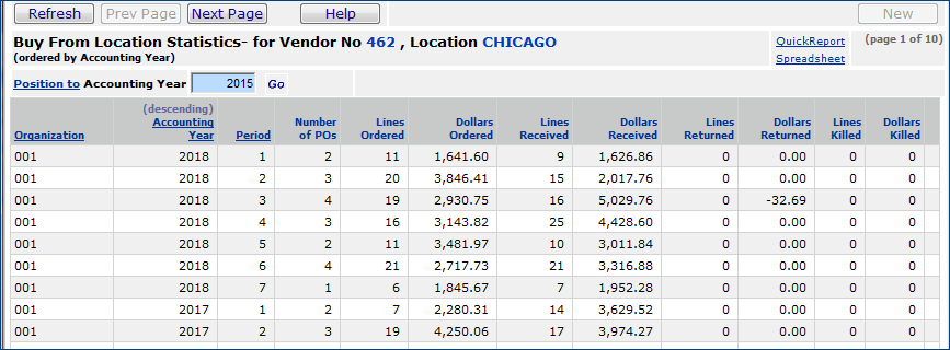 The system lets you view data about your vendor purchases, such as the number of purchase orders sent to a buy-from location in a year or period, the dollar amount of items