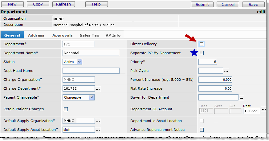 You can specify a department or a vendor buy-from location as direct delivery. You use the Direct Delivery check box on the Department panel to set direct delivery for a department (Figure 1, next to the red arrow). Similarly, the Direct Delivery check box on the Vendor Buy-From Location panel sets direct delivery for a vendor buy-from location (Figure 2, next to the red arrow). (We will discuss the field next to the blue stars and the gold star below.)
