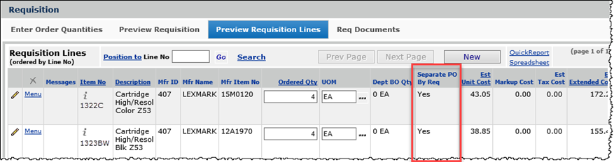 For purchase orders generated from requisitions, the field Separate PO by Requisition can be selected on the requisition line (Figure 3). When the field is selected, the requisition line is entered on a separate PO for the vendor. You can select this field on a non-file, non-stock, or direct delivery requisition line.