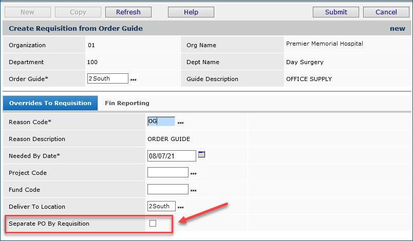 Purchase orders created and processed by the system can be separated in several ways. One way to separate POs is by department. For example, an individual department may need exclusive purchase orders for its items. Or, a vendor may require each department at your site to use a separate PO when ordering items. In either case, you will want to create POs that contain only supplies requested by each specific department.