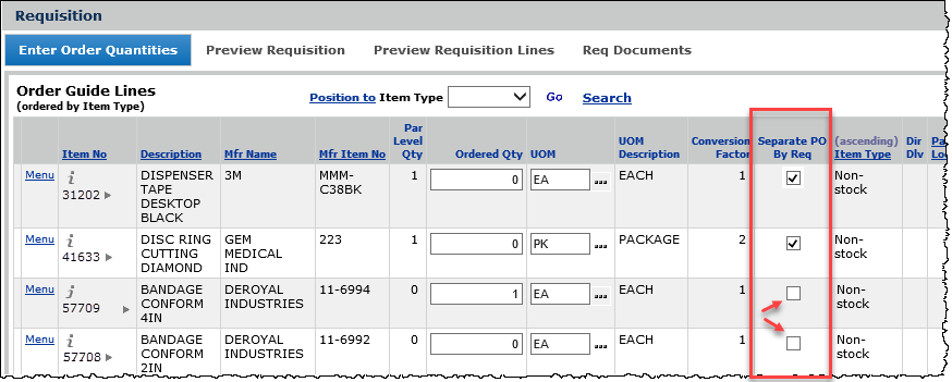 Because your department requires a separate PO and direct delivery, the system includes the stock, non-stock and non-file items. If a separate PO was a vendor requirement (but not required by your department), the system would also put all the items on a single PO. The Ship To Location shows your department's address.