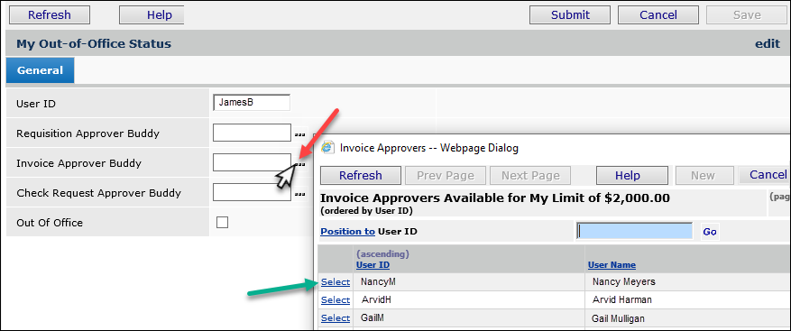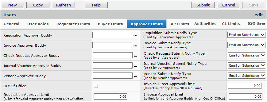 As described subsequently, approvers must be designated as such on their User Profiles. Approvers are assigned approval limits (dollars). You can also set related approval characteristics, such as how the approver is notified when an element requiring approval is available. Each approver can be assigned an Approver Buddy who handles approvals when the normal approver is out of the office.