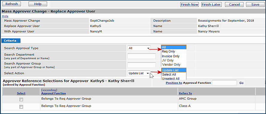 - Search Department (in removing and replacing approvers only) searches for characters that you enter from one or more department names. The list of Approver Reference Selections... on the bottom is filtered for the department(s) whose name(s) contain the characters.