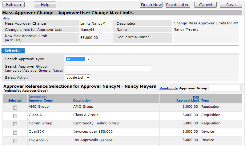 The last step is clicking either Finish Now or Finish Later. When you are changing maximum dollar limits, clicking Finish Now updates the approver groups that you selected for the user with the new dollar limit.