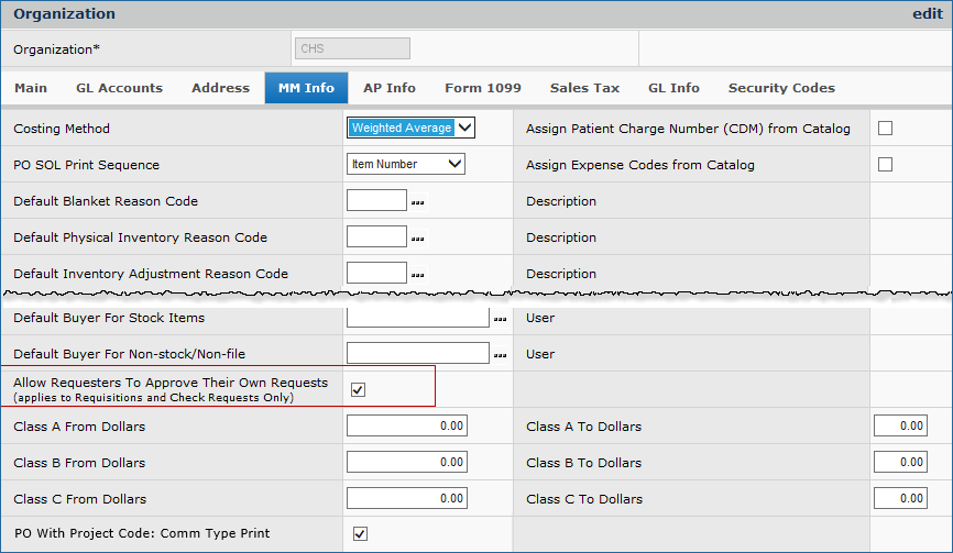 You can assign each department an approver group or a single direct approver (but not both), and an approval profile. Approval profiles contain the dollar limits allowed for different item types (stock, non-stock, non-file) on requisitions.