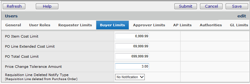 Figure 43 - Using the Limits Tab to Change a Maximum Dollar Limit