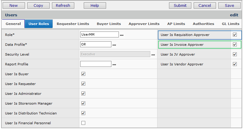 Requisition approvers are typically designated as buyers in their user profiles. User profiles also contain approvers' dollar limits.