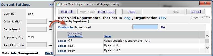 Figure 5 - Selecting the "To" Asset Location Department in Current Settings