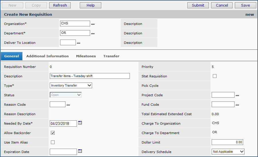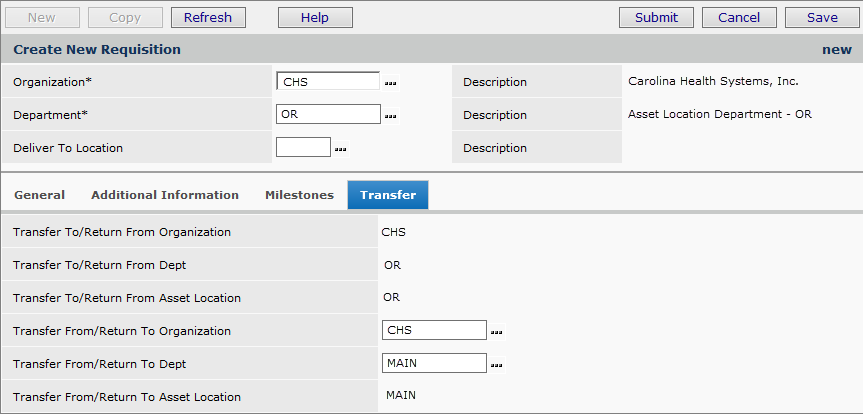 Figure 7 - Create New Requisition Panel - Transfer Tab