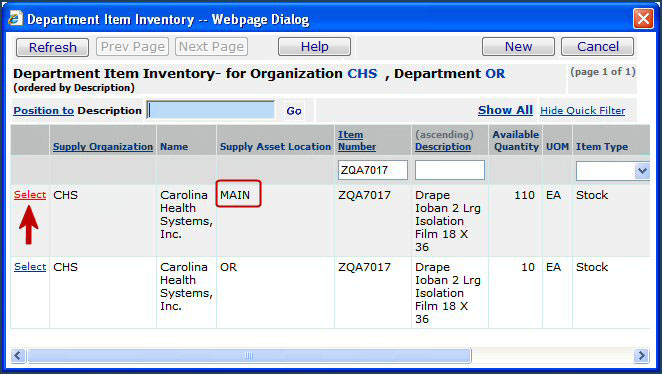 - Select the item for the Supply Organization and Supply Asset Location that are the "from" organization and "from" asset location; in this case - CHS and Main (Figure 9).