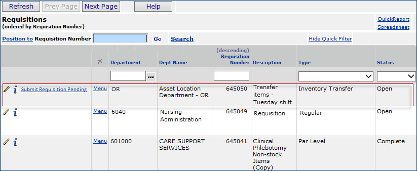 Figure 13 - Requisitions List with Inventory Transfer Requisition Pending