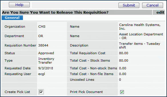 This step puts the requisition items on a pick list at the supplying asset location (MAIN).