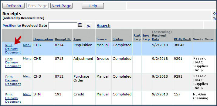 Figure 17 - Receipts List: The First Line Is an Inventory Transfer Requisition Receipt