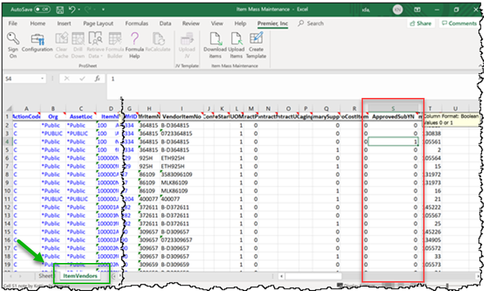 The Excel Item Maintenance template contains the column – ApprovedSubYN -- on the Item Vendors tab. This column lets you identify item vendor records for approved substitute items. (Figure 13).