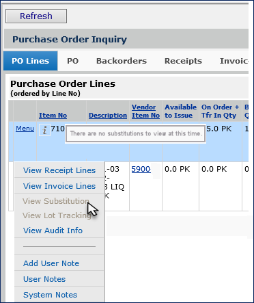 Similarly, on a PO line inquiry, you can also display the original item that was substituted.