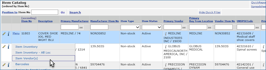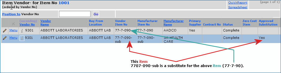 The Approved Substitution flag can be set for any item vendor record, including multi-sourced items. Multiple item vendor records can be designated as substitutes for a single vendor item, since the application looks to match the VIN in the EDI 855 and a VIN in one of the approved substitutions for the same catalog item.For detailed instructions on working with item vendor records, see the online documentation topic "To edit an existing item catalog vendor record or add a new item vendor record." Below is a summary that creates substitute items using the item catalog menus. For multi-sourced items, you can also set up substitutes from the item inventory menus.