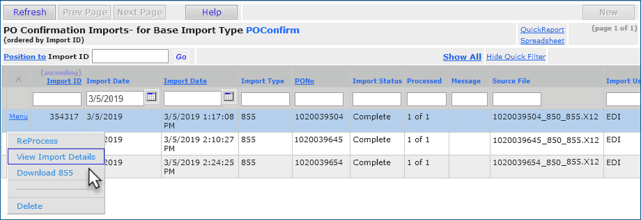 If a substitute item is not valid; for example, if it is not an approved substitute, or has a UOM, quantity, conversion factor, or other required attribute different from the original item, the EDI 855 is in exception, and is available on the EDI Confirm Exceptions list.