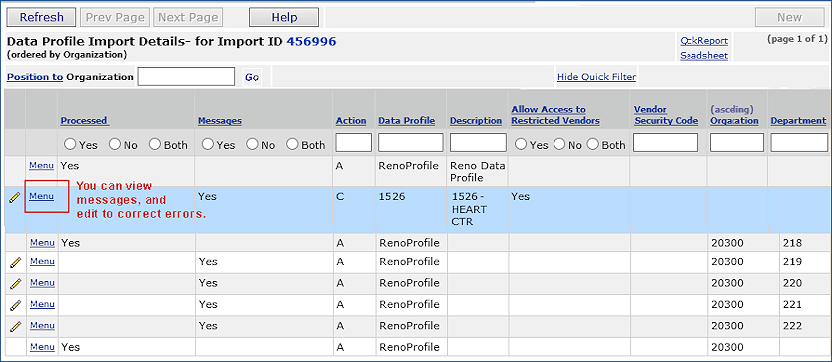 Clicking Menu > View Details lets you display messages and edit the import record.